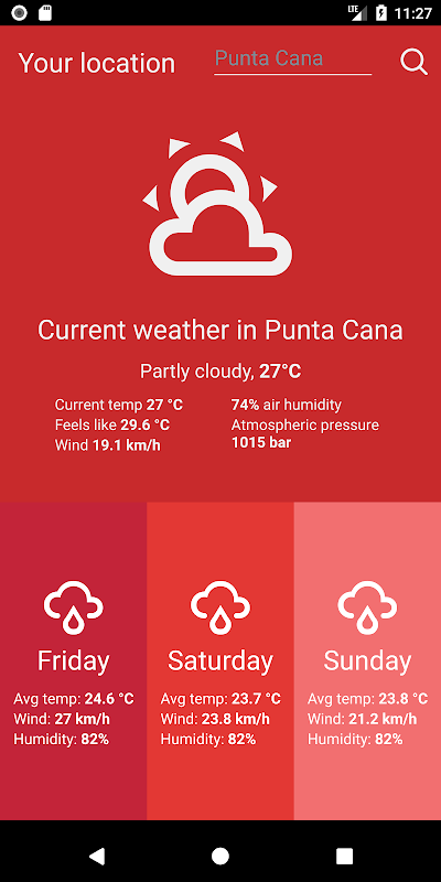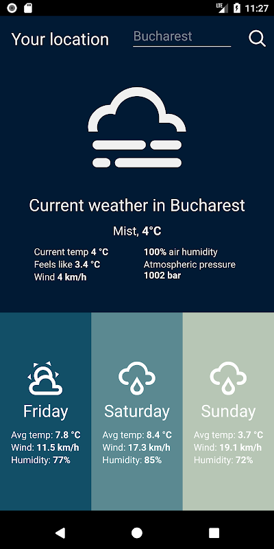 The app will show you basic weather information like current degrees, what the temperature actually feels like, wind speed, air humidity, atmospheric pressure and additional 3 days weather forecast.