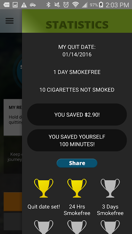 QuitGuide یک برنامه تلفن هوشمند رایگان است که می تواند کمک به ترک سیگار است. شما می توانید میل به سیگار و حالات خود را پیگیری، نظارت بر پیشرفت خود در جهت دستیابی به نقاط عطف smokefree، کشف دلایل خود را برای ترک سیگار، شناسایی محرک سیگار کشیدن و توسعه استراتژی برای مقابله با آنها، دریافت راهنمایی در مورد چگونگی ترک سیگار و آدرس ترک نیکوتین، و دسترسی انواع استراتژی های دیگر برای کمک به شما با موفقیت تبدیل و اقامت smokefree.