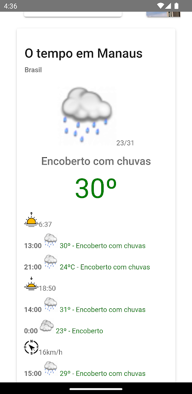 در انتهای صفحه درباره شهر، اطلاعات کامل دمای فعلی را به تفکیک ساعت، حداکثر و حداقل روز و 7 روز آینده مشاهده می کنیم. از جمله اطلاعاتی در مورد طلوع و غروب خورشید، سرعت باد و جهت آن و احتمال بارش باران.