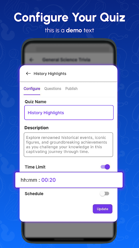 با استفاده از این برنامه سازنده مسابقه برای معلمان، می توانید به راحتی سؤال و پاسخ ایجاد کنید و مسابقات مسابقه خود را مطابق ترجیحات خود میزبانی کنید. نه تنها برای دانش آموزان، می توانید از این برنامه سازنده مسابقه برای دوستان نیز استفاده کنید. میتوانید به راحتی آزمونهای خود را با ویژگیهای مختلفی که شامل محدودیتهای زمانی، انتخابهای متعدد، سؤالات، پاسخها، وضعیت آزمون، زمانبندی و موارد دیگر میشود، سفارشی کنید. شما می توانید یک بازی چیزهای بی اهمیت بسازید، با دوستان خود بازی کنید و استاد نهایی مسابقه شوید.