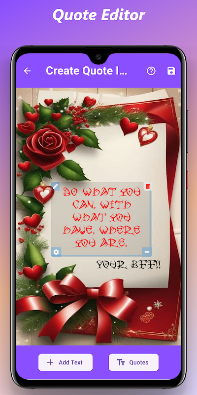 چه فردی باشید که به دنبال ایجاد انگیزه در خود هستید، چه یک تأثیرگذار رسانههای اجتماعی که برند شما را ایجاد میکند، یا یک حرفهای برای تولید محتوا برای تیم خود، Quote Maker - Quotes Gallery همه ابزارهایی را که برای ایجاد تصاویر نقل قول حرفهای نیاز دارید، فراهم میکند. از پیام های عاشقانه صمیمانه گرفته تا اظهارات انگیزشی قدرتمند، خود را با سبک و خلاقیت بیان کنید.