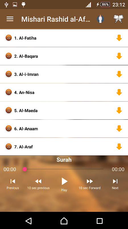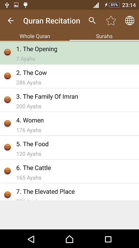 Quran Recitation allows us to listen the surahs, download which one you want. The downloaded surah can be listened without accessing the internet. In the same time you can delete any downloaded surah to free the space.It contains around 50 reciters.