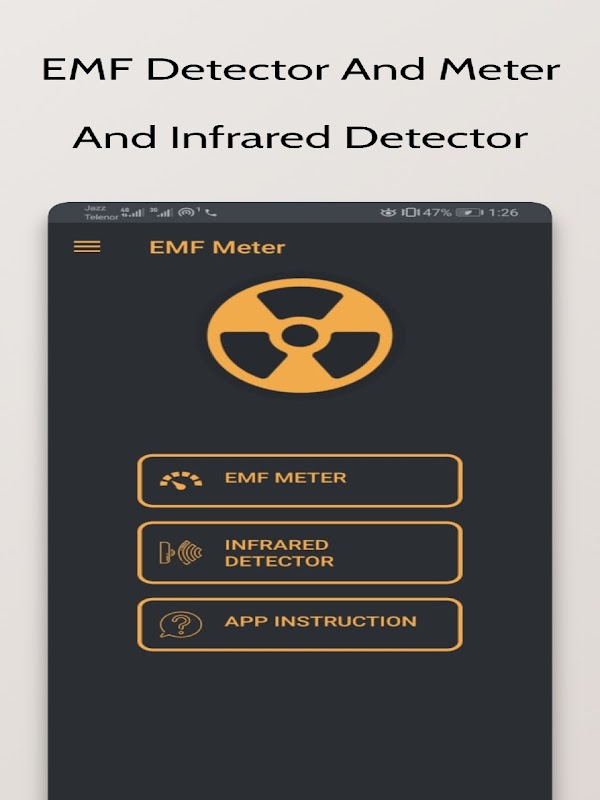 EMF Radiation Finder و آشکارساز تشعشع emf روی بسیاری از دستگاه ها کاملاً کار می کنند، اما برخی از تلفن ها حسگر مغناطیسی ندارند که نمی توانند emf را تشخیص دهند زیرا تشخیص emf روی تابش مغناطیسی کار می کند. این تابش یاب emf رابط کاربری آسانی است فقط در نزدیکی دستگاه های مشکوک حرکت کنید و آشکارساز تشعشع خودکار emf به شما در حال خواندن را نشان می دهد.