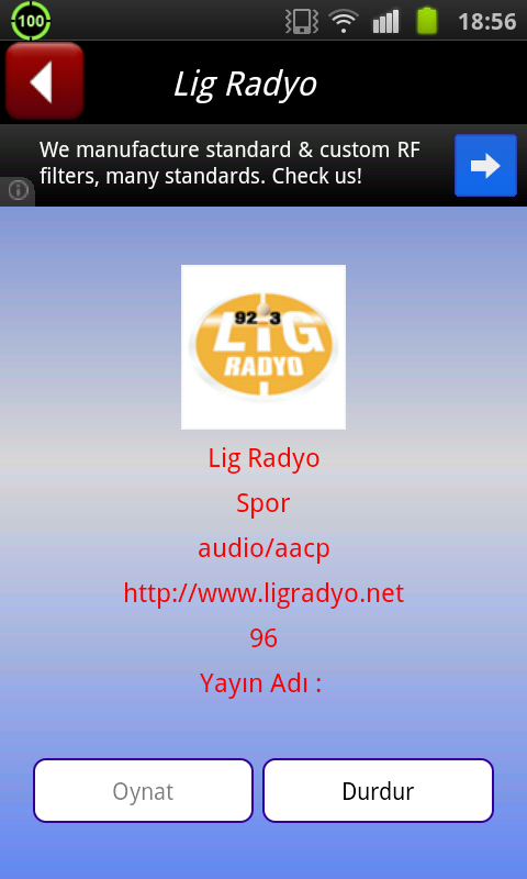 Bu uygulama ile internet (Wi-Fi veya 3G) üzerinden shoutcast radyoları dinleyebilirsiniz. Şu anda 39 tane yerli ve yabancı radyo bulunmaktadır. Program mpeg, aac ve aacp radyo yayınları çalabilme özelliğine sahiptir. Eğer bildiğiniz yayınlar varsa bana iletirseniz eklemeye çalışırım. Program içinden "Geri Bildirim" menü butonuyla mail olarak iletebilirsiniz.