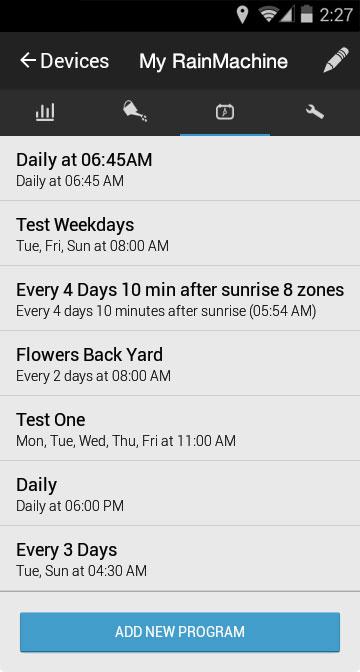 برنامه موبایل اندروید RainMachine تلفن/تبلت اندرویدی شما را به سخت افزار RainMachine شما متصل می کند و به شما امکان می دهد چرخه های آبیاری خود را کنترل و تنظیم کنید، مناطق و ویژگی های برنامه را تغییر دهید، محدودیت تنظیم کنید، خدمات آب و هوا را فعال کنید، دستگاه را به تعویق بیاندازید یا آبیاری را متوقف کنید.
