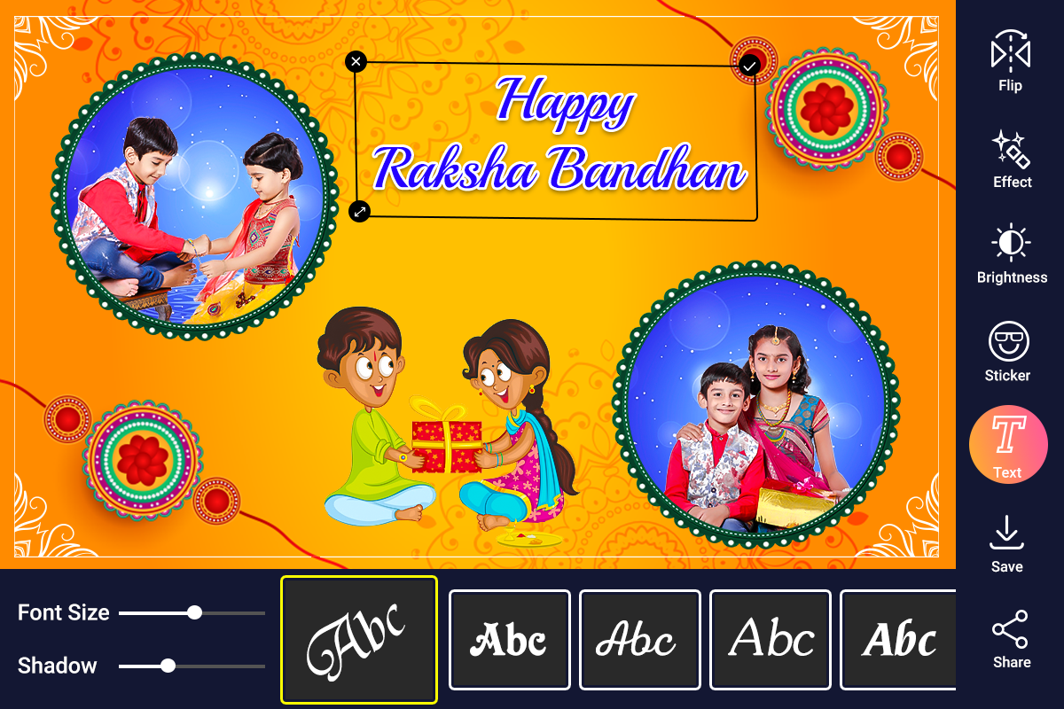 بگذارید قاب عکس Raksha Bandhan را که دوست دارید بهترین انتخاب کنید. سپس ، عکس های خود را از گالری اضافه کنید. می توانید حرکت ، زوم ، تلنگر ، آینه را بچرخانید ، عکس را بچرخانید و برچسب های دوست داشتنی و متن متن اضافه کنید.