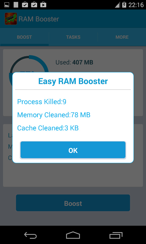 This RAM Memory Booster is a powerful tool designed to optimize memory use for tablets or phones. It reclaims lost memory for your programs by using a smart and powerful defragmenter, thus recovering memory leaks and cleaning running applications which are no longer in use.
