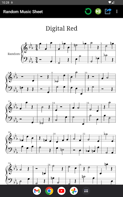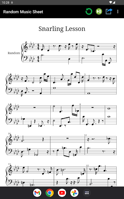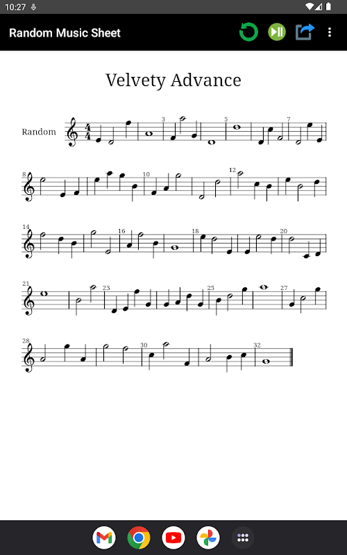 نت موسیقی تصادفی به شما امکان می دهد تعداد نامحدودی نت های موسیقی تصادفی، منحصر به فرد و زیبا تولید کنید. برگه های تولید شده ممکن است برای تمرین بینایی خوانی، مطالعه الگوهای موسیقی و ایده های ترکیب بندی استفاده شوند. برگه ها همچنین ممکن است به صورت PDF، MusicXML یا MIDI پخش و صادر شوند. ویژگیهای مختلف صفحه موسیقی را میتوان تنظیم کرد که عبارتند از: