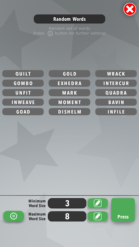 مجموعه ای از کلمات تصادفی را از فرهنگ لغت داخلی ما با طول کلمات از 3 تا 8 حرف ایجاد کنید. روی هر کلمه ای کلیک کنید تا تعریف آن را بیابید. ایده آل برای بازی های کلمه، طوفان فکری، یادگیری زبان، و ایجاد ایده ها یا رمزهای عبور منحصر به فرد.