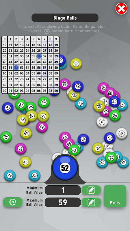 توپ های پرنده یکنوع بازی شبیه لوتو را روی صفحه نمایش خود تماشا کنید و تعداد توپ هایی را که می توانید از بین آنها انتخاب کنید انتخاب کنید. این برنامه همچنین دارای یک شبکه برای ردیابی توپ های کشیده شده است که در صورت تمایل می توان آن را پنهان کرد. ایده آل برای شب های بینگو خانوادگی یا قرعه کشی های معمولی.