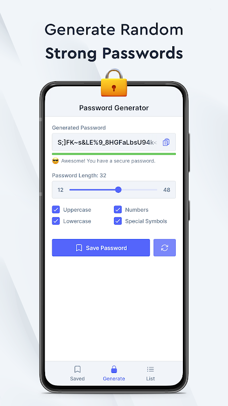شما می توانید به طور تصادفی رمزهای عبور قوی با ترکیبی عالی از حروف کوچک و بزرگ، اعداد و نمادهای خاص ایجاد کنید. شما می توانید رمزهای عبور بین 12 تا 48 کاراکتر ایجاد کنید و هر چند بار که دوست دارید آنها را بازسازی کنید. از راحتی ایجاد امن ترین رمزهای عبور با یک فیلد اطلاعاتی که سختی یا قدرت رمز عبور را نشان می دهد، لذت ببرید. ایجاد رمز عبور با Password Generator سریع، آسان و قابل اعتماد است.