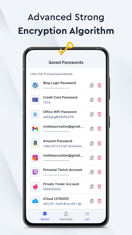 همچنین می توانید هر رمز عبوری را که می خواهید ذخیره کنید، با دادن یک نام و نماد توصیفی به آن ذخیره کنید. شما به راحتی می توانید همه رمزهای عبور خود را هر زمان که به آنها نیاز داشتید کپی کنید و با یک حرکت ضربه بزنید. Password Generator همچنین می تواند به عنوان یک مدیر رمز عبور با ویژگی "Saved Passwords" تعریف شود.