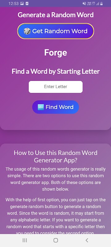 - با کمک ویژگی حرف، کاربر می تواند حرف را وارد کند و یک کلمه تصادفی تولید می شود که از همان حرف خاص شروع می شود.