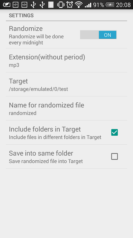 App will select a file randomly from the selected folder, copy to the file named "randomized"(name can be changed manually), and save it into the folder "Randomized" at local directory. The "randomized" file will be replaced with one of the other files in the selected folder at every midnight.