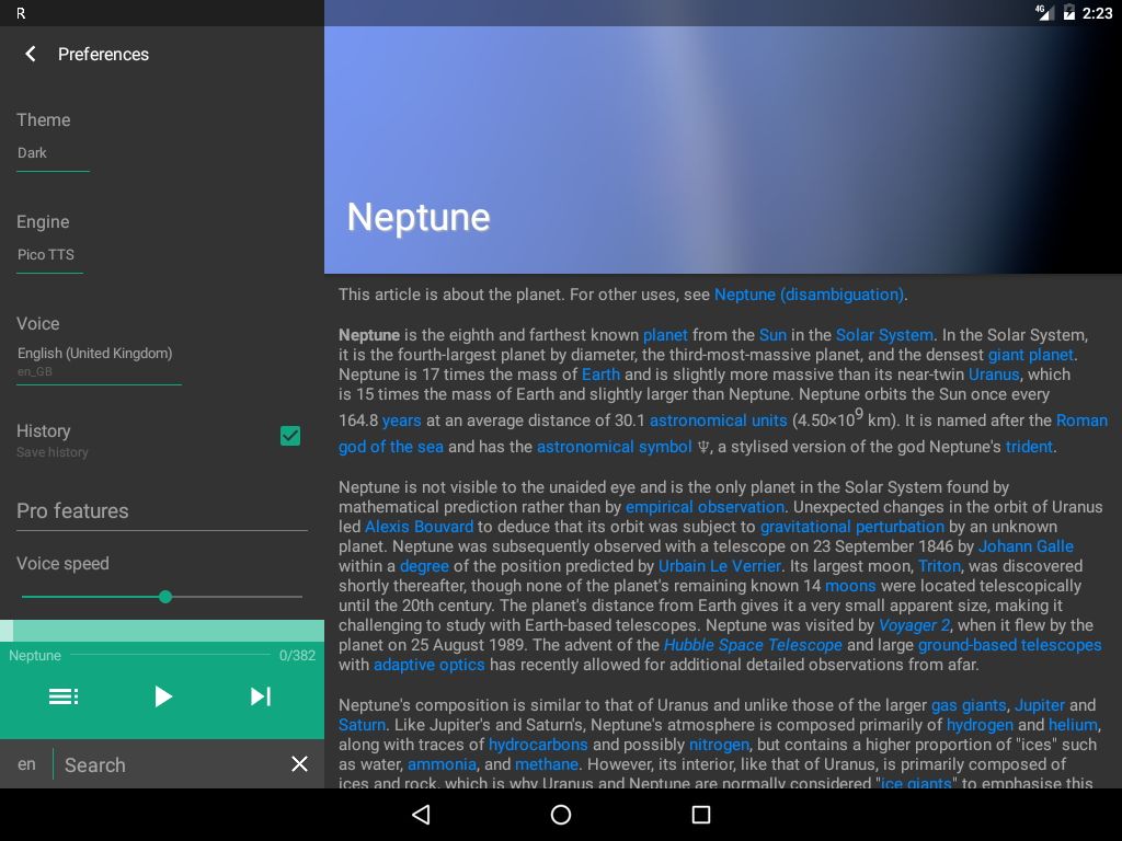 Play Wikipedia™ articles with Text to Speech (TTS) using this music player-like app. Use the play queue and offline mode features to always have content to listen to.