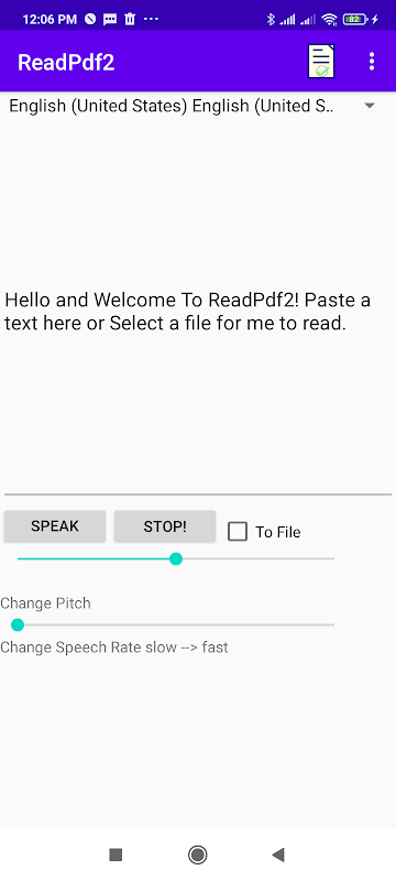 ReadPdf2 یک برنامه تبدیل متن به صدا است که هر فایل متنی را در دستگاه شما با صدای بلند می خواند. با استفاده از استخراج کننده متن داخلی می توان از یک فایل PDF خواند. نیازی به تایپ نیست متن یا فایلهای pdf را در دستگاه خود با صدای بلند بخوانید. انتخاب کننده فایل به شما امکان می دهد فایل مورد نظر را برای خواندن انتخاب کنید. انتخابگر زبان ، انتخاب زبان را فعال می کند. پشتیبانی از خواندن فایل های pdf بزرگ با تقسیم فایل های tts.