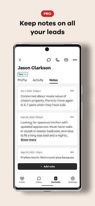 مدیریت سرنخ خود را ساده کنید و با آخرین ابزار صندوق ورودی ما با برنامه Realtor.com® PRO در تماس نزدیک با مشتری باشید. فوراً به سرنخهای جدید دسترسی پیدا کنید و در عین حال با سرنخهای فعلی خود همگام باشید. خط لوله خود را به راحتی با مشاهده وضعیت یک نگاه و حرکت مدیریت کنید.