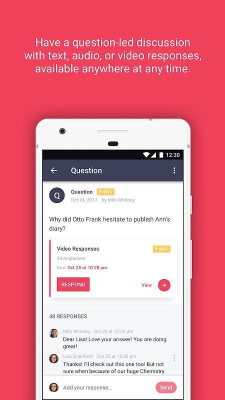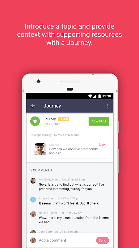 App capabilities includes the ability to view Journeys, respond to questions with chat and video, and ask questions for private and public discussion. All actions get prompted within the app, and are setup from the teacher account accessed through the web.