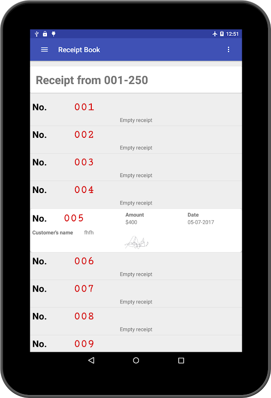 With this app, you can create several receipt books each with its own template or header information such as Company name, Contacts, Address, Currency, Logo, Stamp e.t.c.