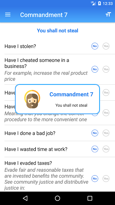 سازگاری برنامه کاربردی است که به شما اجازه می دهد تا به وسیله ی یک سری سوال ساده ی مربوط به هر یک از فرمان ها، شما را به انجام معاینه ی کامل وجدان خود بسپارید و به شما اجازه می دهم که دیدگاه روشنی از گسل ها بر اساس کتاب مقدس و دستورات مطابق با خدا باشد قانون هنگامی که امتحان کامل می شود، نتیجه ذخیره می شود و می تواند به راحتی برای انعکاس بازیابی شود و به عنوان یک راهنما در اعترافات کاتولیک بعدی شما عمل کند.