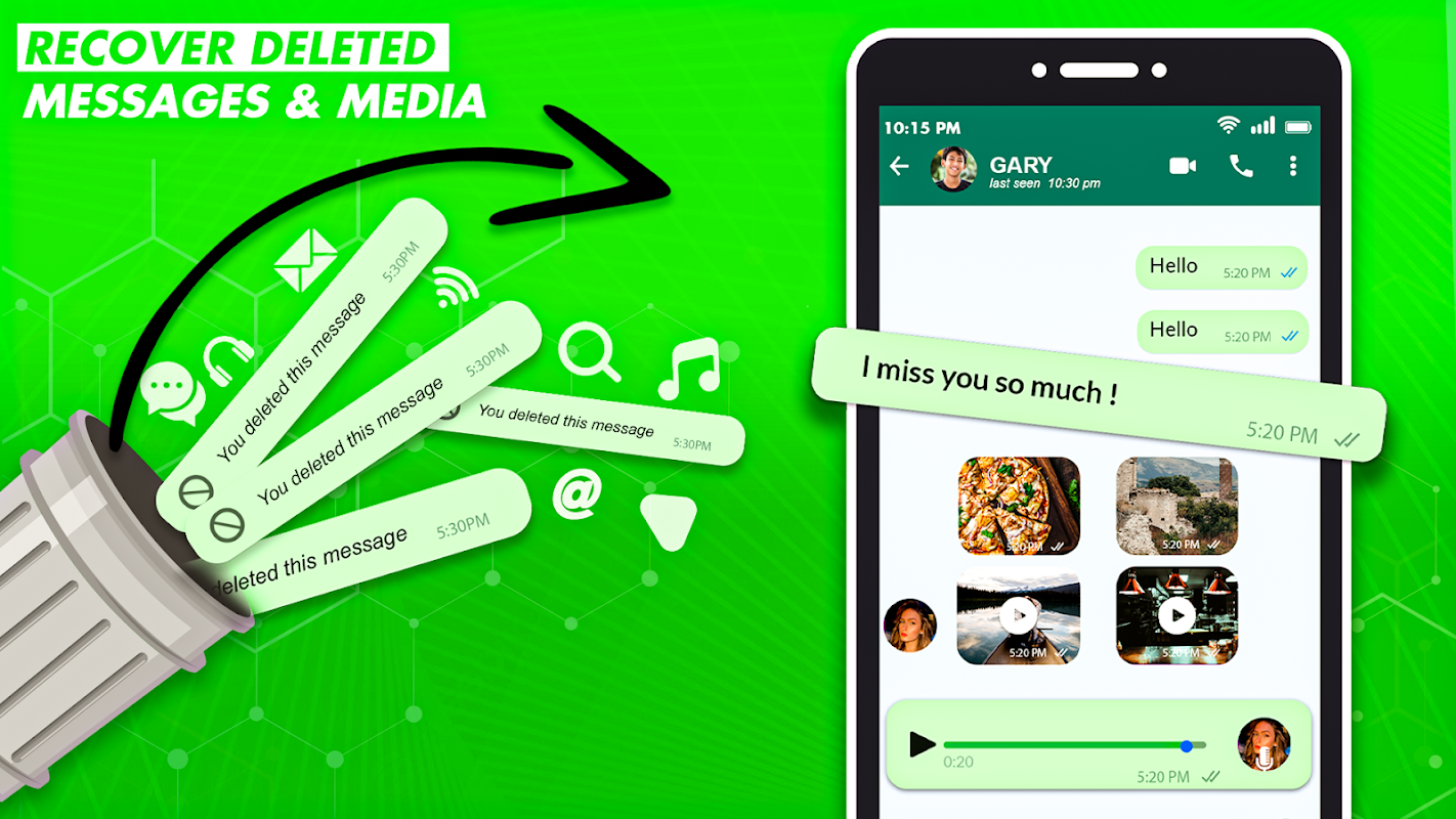 بازیابی پیام حذف شده برنامه WA سعی می کند رسانه حذف شده را بازیابی کند اگر فرستنده آن را حذف کند. نگران نحوه بازیابی پیام های متنی حذف شده و بازیابی فایل رسانه نباشید. بازیابی پیام های حذف شده WA برای شما اعلان ارسال می کند. انواع رسانه های زیر با استفاده از برنامه wamr می توانند فیلم ها، تصاویر، گیف های متحرک، صدا، برچسب ها، یادداشت های صوتی، اسناد بازیابی شوند.