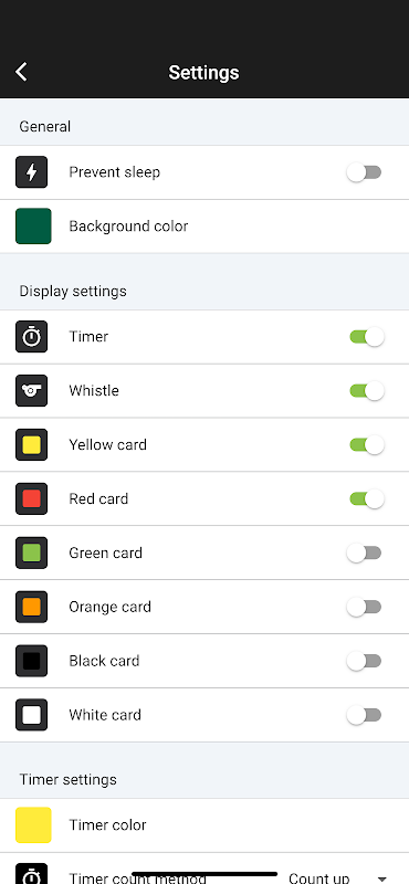 در صفحه نمایش اولیه، "کارت زرد" و "کارت قرمز" نشان داده شده است، اما کارت های رنگی دیگر را می توان در تنظیمات نمایش داد.