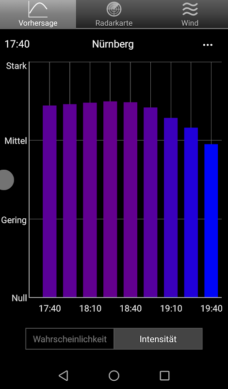 پس از شروع برنامه، مکان فعلی به طور خودکار تعیین می شود و سپس پیش بینی مربوطه با احتمال و شدت بارندگی در دو ساعت آینده بارگیری می شود.