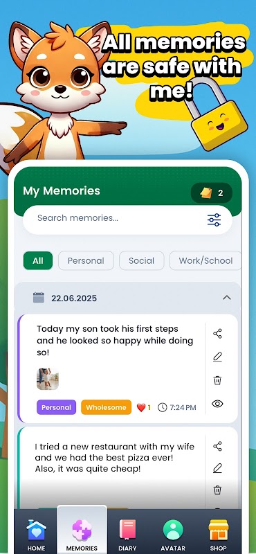 خاطرات را بر اساس دسته بندی (شخصی، اجتماعی، کاری، سرگرمی) ذخیره و سازماندهی کنید.