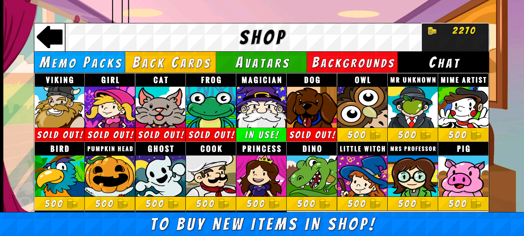 - خرید: خرید مطالب جدید ، مانند کارت های یادداشت جدید ، پس زمینه ، چت ، ...