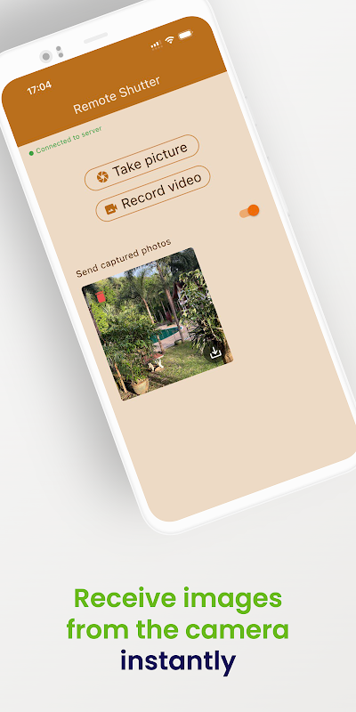 در دستگاه دیگر خود: برنامه "Remote Shutter" (برنامه پولی) را باز کنید و روی دکمه عکس ضربه بزنید تا شاتر دوربین در تلفن از راه دور فعال شود، یا روی دکمه ضبط ویدیو ضربه بزنید تا فیلم بسازید.