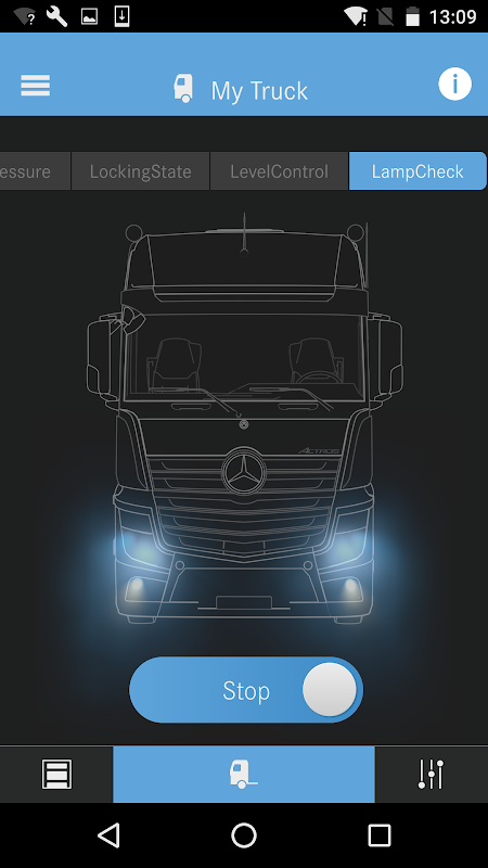 The Remote Truck App displays current vehicle data to the user. Further on exclusive vehicle functions can be controlled. Monitore: -Total Kilometer -Engine Hour -Fuel Level -Adblue Level -Outside Temperature -Inside Temperature -Brake Pressure1 -Brake Pressure2 -Tire Pressure -Tire Temparature -Tire Sensor Battery Status -Axle Load -Locking State Control: -Sunroof -Level Control -Lampcheck -Working Lamp -Independent Heating -Parking Cooler -Interior Light -Audio -Unlock Tail Lift. Connection: WIFI, Range: 25m around the vehicle