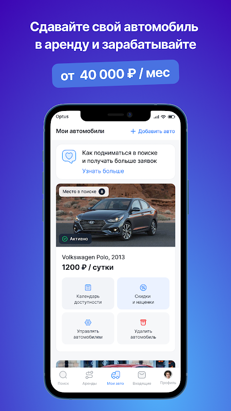 با شماره تلفن ثبت نام کنید، اسناد را بارگذاری کنید و ماشین عالی را اجاره کنید. به طور معمول، صاحبان خودرو در عرض 25 دقیقه به درخواست ها پاسخ می دهند.