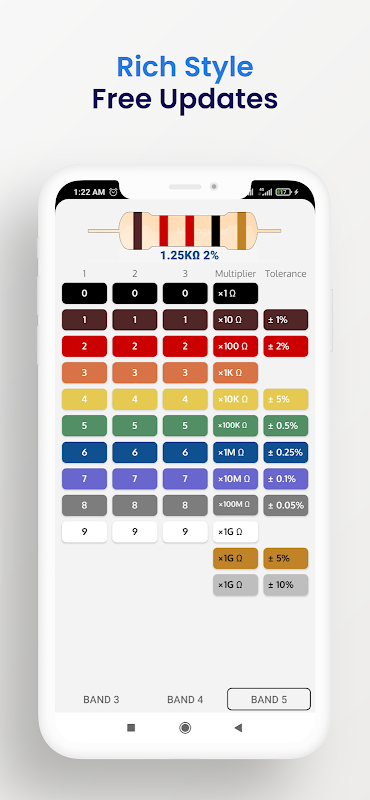 این نرم افزار یک محاسبه کننده کد رنگی آسان برای محاسبه مقاومت یک مقاومت است. این برنامه از کدهای رنگی برای مقاومتهای 3 ، 4 ، 5 باند پشتیبانی می کند.