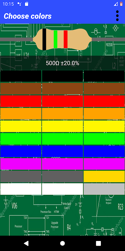 کد رنگ الکترونیکی کدی است که برای مشخص کردن امتیاز برخی از اجزای الکتریکی خاص مانند مقاومت در اهم یک مقاومت استفاده می شود. از کدهای رنگی الکترونیکی نیز برای اندازه گیری خازن ها ، سلف ها ، دیودها و سایر قطعات الکترونیکی استفاده می شود ، اما بیشتر برای مقاومت ها استفاده می شود. فقط با استفاده از این ماشین حساب ، مقاومت ها را نشان می دهد.