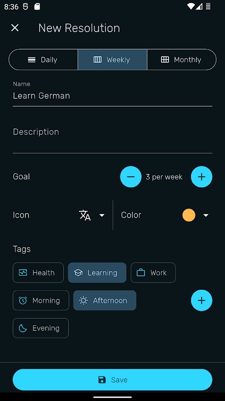 اضافه کردن Resolutions جدید در عرض چند ثانیه. یک عنوان، توضیح کوتاه وارد کنید و یک آیکون و رنگ برای شروع انتخاب کنید.
