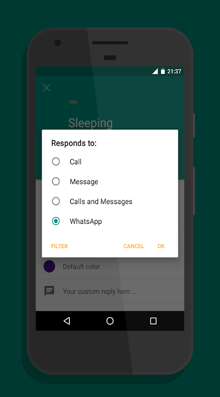 Responder is the best top rated message reply app ever made for Android. It sends auto-reply to messages ,calls and WhatsApp also.