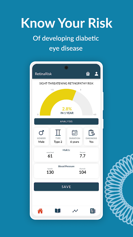 این الگوریتم معتبر از نظر بالینی به کاربران اجازه می دهد تا با درج مشخصات ریسک خود (نوع و مدت دیابت ، جنسیت ، رتینوپاتی موجود ، HbA1c و فشار خون) خطرات فردی خود در زمینه ابتلا به بیماری چشم را تهدید کنند. این برنامه کاربران را قادر می سازد تا نتایج ریسک خود را مورد تجزیه و تحلیل قرار دهند تا در مورد عوامل خطر اصلی تأثیرگذار بر نتایج فردی خود آگاهی یابند و به آنها امکان می دهد اقدامات کمتری را برای کاهش ریسک انجام دهند. دریابید که آیا خطر ابتلا به رتینوپاتی دیابتی تهدیدکننده بینایی در معرض خطر بالا یا پایین است. برای کاهش خطر خود و رسیدن به سطح هدف ، بدانید که چه کاری باید انجام دهید