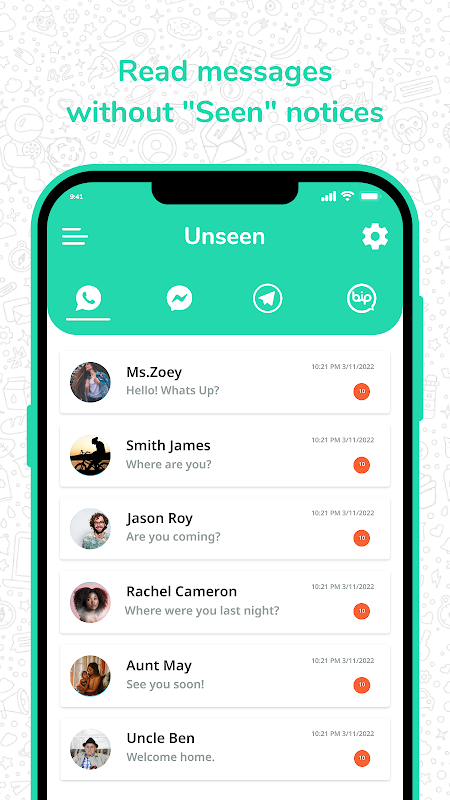 دیده نشده | بازیابی پیام های حذف شده را تایید نمی کند و به هیچ وجه به Whatsapp، Messenger، Instagram، Imo، Bip، Viber، Telegram، Line، IMO یا VK وابسته نیست.