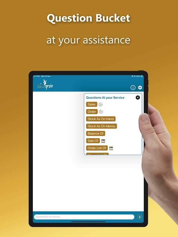 برنامه دست راست برای نرم افزار Smart Jewel ERP ، برای دانستن فروش ، تعادل ، سفارشات جواهرات در زندگی روزمره با دستور صوتی و سینت سایزرها استفاده می شود.