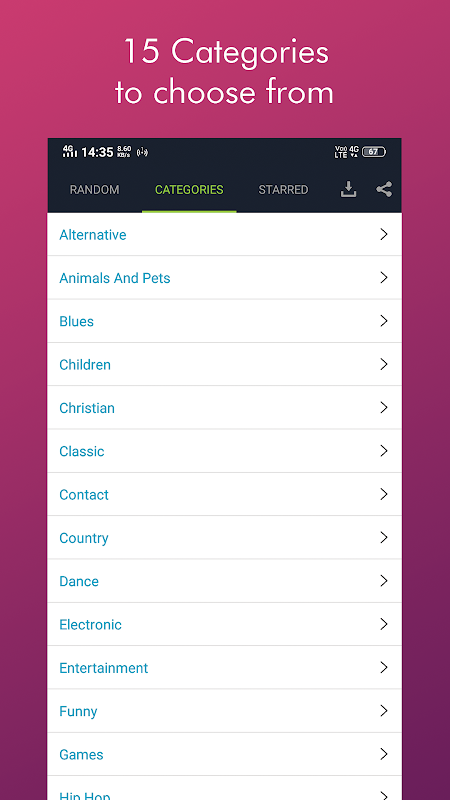 Our App has 10 categories and each category has more than 500 tones which you can randomly choose from. You can easily set the tones as Caller Ring, Alarm, Contact Tones or Download it for Listening. More than 500 tones are available on our app and there are more to come. We are updating our library everyday. Popular collection of Bass, Animals, Funny, Notification, Music, Alarm, Blues, Classic, Soothing, Islam & Hindu tunes available in the app.