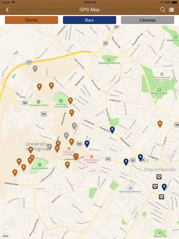-GPS turn-by-turn directions to student dormitories, libraries, and local bars