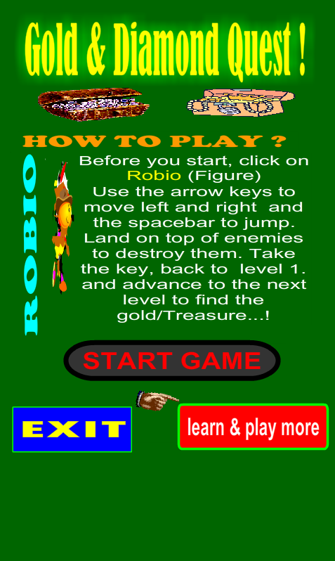 این بازی پلتفرم کاملا رایگان و بدون تبلیغات است ، که شامل راهنمایی یک بازیکن Robio برای پرش / دویدن بین سیستم عامل های معلق ، بیش از موانع و دشمنان در سطح 3 برای گرفتن کلید گنج است.