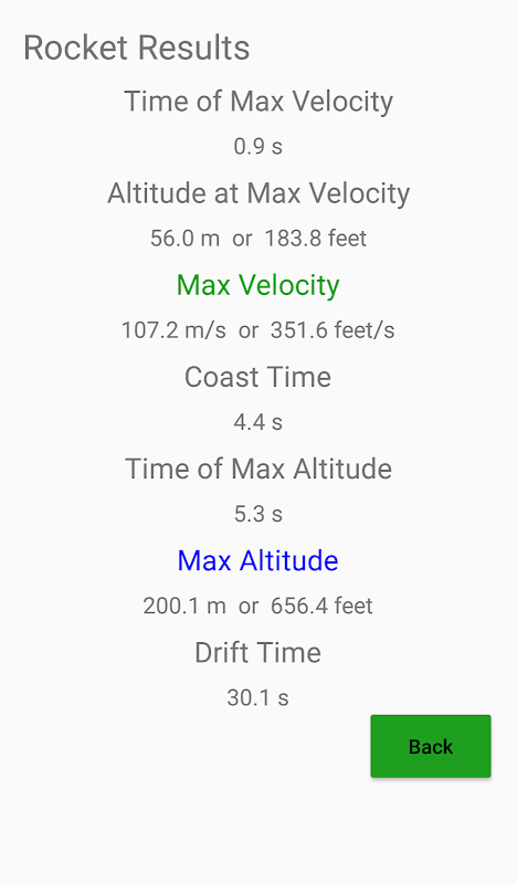 شما همچنین می توانید زمان حداکثر ارتفاع مدل موشک و مقدار زمان موشک ساحل را پیدا خواهد کرد. این اجازه می دهد تا شما را به انتخاب موتور موشک با یک تاخیر قبل از تخلیه شارژ به طوری که چتر نجات می کند خیلی زود و یا خیلی دیر استقرار است.