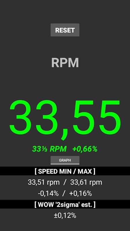 RPM Speed & Wow به شما امکان می دهد تا به سرعت سرعت چرخشی خود نگاهی بیندازید یا میانگین سرعت، تغییرات min / max و wow را اندازه گیری کنید.