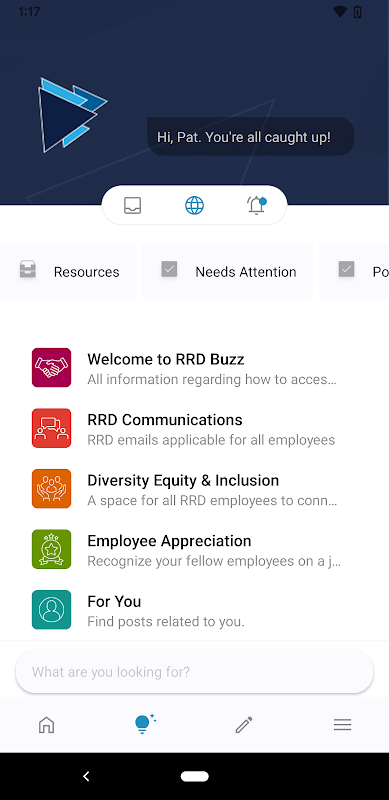 ● درگیر شوید: با لایکها واکنش نشان دهید، عکسها و مقالات ارسال کنید، به نظرسنجیها پاسخ دهید، افتخار شرکت را به نمایش بگذارید، ایدهها را به اشتراک بگذارید، و به موضوعات مورد علاقه با همکاران بپیوندید تا جوامعی ایجاد کنید و فرهنگ RRD را بسازید.