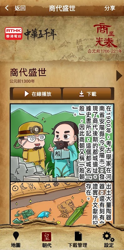 آیا می خواهید از کمیک های چهار فریم فوق العاده عصر طلایی لذت ببرید؟ به داستان رادیو درام شنگشی گوش کنید؟ اکنون برنامه تلفن همراه "RTHK Five Thousand Years of China" را دانلود کنید تا در هر زمان به تاریخ قدم بگذارید و دوران پر رونق چین را درک کنید!