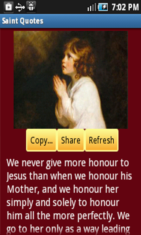 مظنه سنت اندیشه یک برنامه رایگان است که حاوی نقل قول های تصادفی از پرستاران کاتولیک است که می تواند به شما حکمت در مورد جنبه های مختلف زندگی و ایمان است. نقل قول ها را می توان از طریق اس ام اس، ایمیل و شبکه های اجتماعی مختلف به اشتراک گذاشته می شود. برای به اشتراک گذاشتن نقل قول از طریق فیس بوک، به سادگی بر روی دکمه "کپی" و سپس "اشتراک گذاری" و فقط چسباندن نقل قول کپی شده بر روی وضعیت فیس بوک خود را. این برنامه همچنین دارای یک توضیح ساده از چه قدیسین هستند و به همین دلیل است که ما از آنها بخواهید که برای ما دعا کنید.