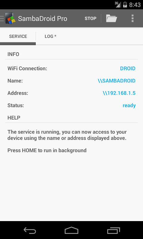 This application allows you to share/manage files on your device easily from any PC of your network: once started just type [Win]+[R] in your computer, write \\SAMBADROID and enjoy!