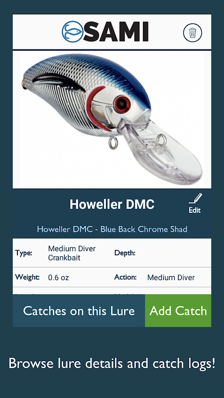 Keep track of all your lures together in one quickly accessible database. Instead of digging through your hook-tangled tackle box, look through SAMI and choose the lure you want to use. When you catch a fish, simply hit the Catch button and that lure, its color, the location of the catch, environmental conditions and the time are instantly logged. Enter the weight and take a picture to save to your log or share with friends.