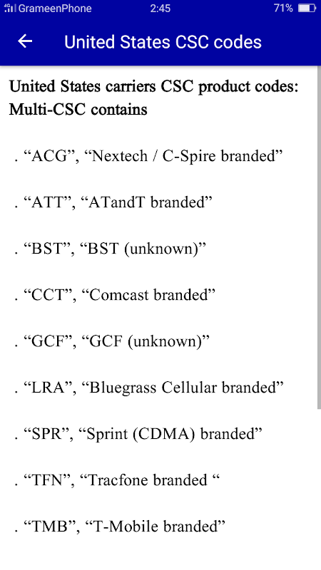 CSC مخفف Country Specific Code Guide است. برای هر شما خاص است. اس آ . یا مکان یا ارائه دهنده جامعه. در اینجا، ما فهرستی از تمام راهنمای کد CSC یا محصول به همراه ایالات متحده آمریکا یا شرکت مخابراتی که به آن تعلق دارد، ایجاد کردهایم. ما اساسا Multi-CSC را به 4 جزء طبقه بندی کرده ایم. اولین مورد متعلق به اپراتورهای مخابراتی مختلف در داخل ایالات متحده مانند Sprint، AT&T، T-Mobile، Verizon و غیره است. دوم و سوم متشکل از اپراتورهای مشابه در کانادا و Vodafone. در نهایت، ما نسخه های جهانی یا بین المللی را نمایه کرده ایم.